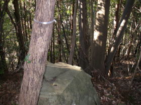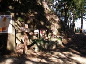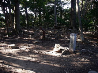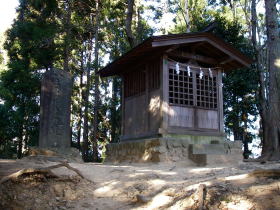 | 八王子神社の後ろで、20m程高いところにある本丸跡の石碑と祠。城山の山頂かも。 |