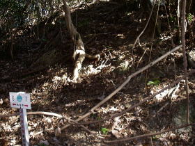| 本丸跡から富士見台の方に向かう道らしいものがあったので辿ってみると、赤布や境界標があり、古い登山道のようでした。しかし八王子神社に戻り気味の道になったので、道を外れて富士見台の方に向かい、右に写真の斜面を下って縦走路に出ました。 |