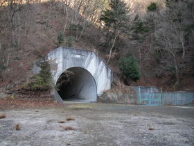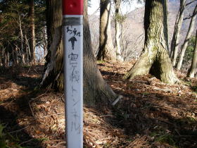 | トンネルの北端で宮ヶ瀬尾根への取り付きを探すと、右側にはそれらしい踏み跡があり、左側にも上の方に赤布があるのが見えました。ちょっと楽そうに見えた右側の踏み跡を辿ることにしました。 |