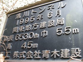 | トンネルの南側の入口の頂部にトンネルの名前がないので探してみたら、木に隠れてこのネームプレートがついていまた。清川トンネルということが確認できました。 |