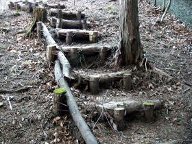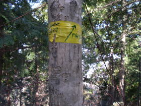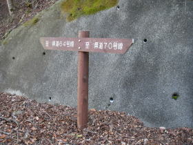 | 稜線に出たところからP525にかけては丸太のステップや丸太で土留をしたところがあり、このような道標もある登山道でした。 |