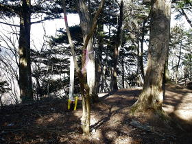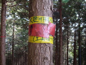 | 堤川林道終点への分岐を示す道標と注意を喚起するためらしい赤布。P597は間伐材が放置されていて居心地が悪いのでここで昼食。 |