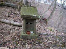 | 物見峠分岐にある石祠。このあたりではハート型を逆さにした形の穴のある石祠をよく見かけます。 |