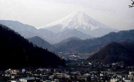 | 登り出すとまもなく富士山が見える。低いところなのに山並みに遮られず下のほうまで見える。霞んでいたが絶好の展望の場所のようだ。 |