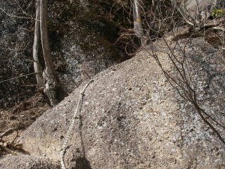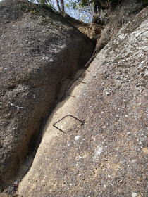 | 兜岩には鎖やロープがある岩場が2箇所ありました。どちらにも林内経由と書いた巻き道があることを示す道標がありました。 |