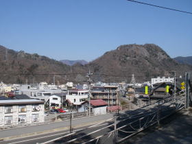 | 駅から歩き出してまもなく家の間から岩殿山が見える。 |