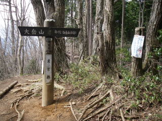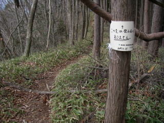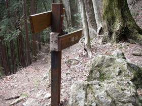 | 大楢峠近くの稜線を外れるところの道標。大楢峠で尾根を見ると急勾配の段差があり、直進していれば、降りるのに苦労したかも。 |