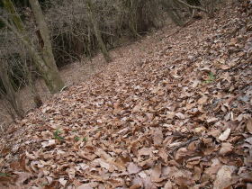 | 稜線から外れた後の落ち葉に埋れた道 |