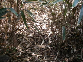 | 登り始めの杉の人工林を過ぎて雑木林になると薮がちょっとうるさいが、間もなく人工林になり道の藪はなくなる。 |