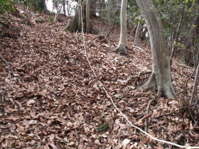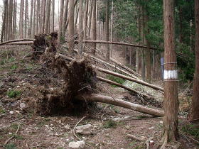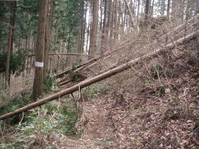 | 上養沢への分岐付近では道に倒れかかった木があって、歩きにくいところがありました。 |