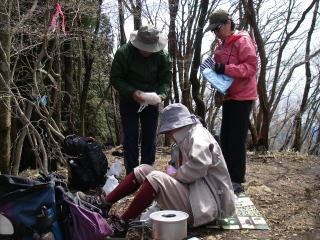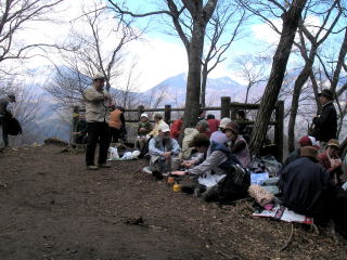 | 鳴虫山の山頂はたいへん賑わっていました。なんとか場所を確保しカップ麺やコーヒーを味わうことができました。 |