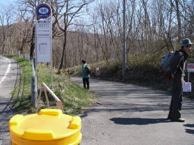 | 隠れ三滝のバス停からマツクラ滝付近までは舗装道路。道路脇の草は刈られていて、カタクリやキクザキイチゲが咲いていました。 |