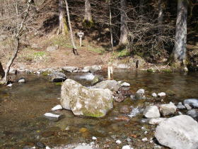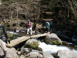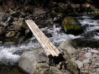 | マツクラ滝はこの沢の向こう側。丸太の橋は一部が水没していて滑りそう。だがちょっと上流にも丸太の橋がありました。 |