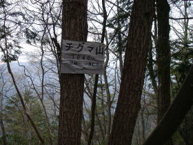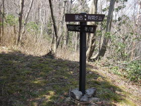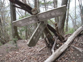 | 槙ノ尾山の山頂の道標。仙岳尾根で落合に行く道がガイドされている。 |
