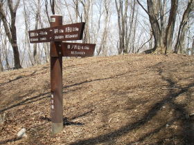 | 送電線の鉄塔を過ぎ、日向沢ノ峰が近づくとこの三つの分岐の道標がが相次いで現れる。 |