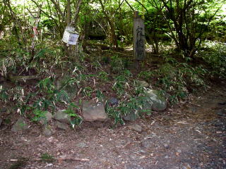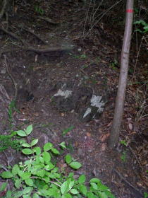 | 道証地蔵から山道に入り、送電線の鉄塔の脇の上りの道が下りに変わるところに浜立尾根取付を示す赤布が幾つもありました。 取付からちょっと登ると山道を横断しました。古い山道かもしれません。 |