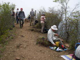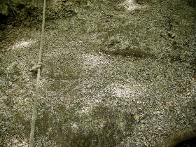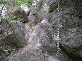 | お助け紐のある岩場も。岩に粗い砂を撒いたような岩場で、滑りそうなので慎重に歩きました。 |