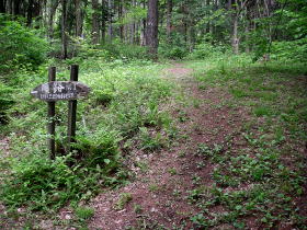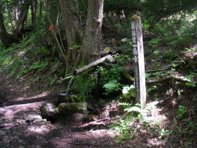 | 赤布に導かれて進むと、林道がヘアピン状に曲がっているところから林道が分岐しているところに出ました。 |