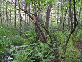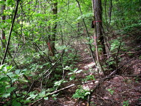 | 左に進むと一時踏み跡は分かりにくくなりましたが、赤布や境界標のあるこのルートに出ました。写真は特に赤布がたくさんあったところです。 |