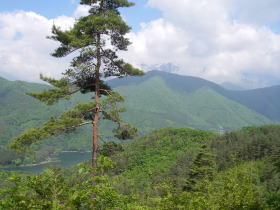 | 山頂からの西側の眺望は開け、爺ヶ岳らしき山や木崎湖を見ることがでいました。また山頂から北の方に延びる道を探ってみましたが、ハッキリとした道はありませんでした。無理矢理辿っても結局は湿地に踏み込むことになるので敬遠して戻りました。 |