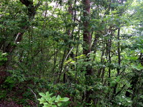 | 戻るとき、林道から居谷里山に入ったところの先の林道のようすを見ようとちょっと行くとすぐに終点になり、2m位の間隔で赤布が二つありました。赤布の間を進むようにガイドしているような感じなので先のようすを見てみると急な斜面で、道らしきものはありませんでした。 ここを直滑降のように下れば居谷里神社の裏手に出られそうですが止めました。 |