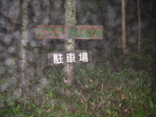 | 登山口。駐車スペースは5台ほどでしょうか。雨着や傘は要らない小雨でしたが、雨粒がたくさん写ってしまいました。 |