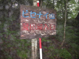 | 今回の北海道山行の第一弾でしたが、あまり天気に恵まれず、幸先の良いスタートとはなりませんでした。林道のゲートの鍵を借りる手続は、初めてのことで心配していましたがうまく行きました。 ピセナイ山は登る人が多いらしく、登山道は良く整備されていて助かりましたが、それでも雨に濡れた藪で膝から下はびっしょりになりました。下山後、ペラリ山の登山口に向かいました。 |