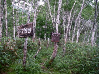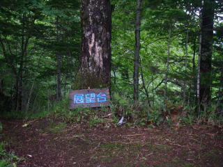 | 六合目。山頂につながる稜線に出たといった場所で、ここを境に背の高い木が少なくなり、稜線沿いに少し遠くが見えるようになりました。 |