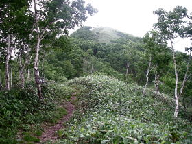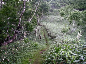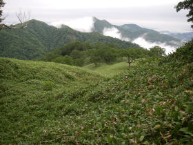 | 七合目付近から振り返って見ると、歩いている尾根の腹は一面の笹原とまばらな樹木。 |