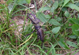 | 山頂にいたミヤマクワガタ。体長は65mm程でした。草の上にいるとこれで大丈夫かと心配でしたがそのままにしておきました。 |