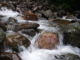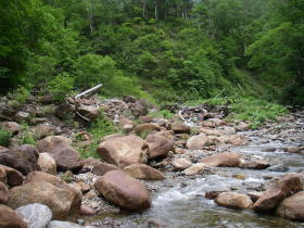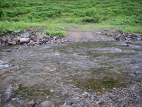 | 山荘近くの渡渉点。靴を履いたまま沢に入って渡りました。 |