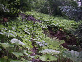 | 帰路、440m二股を過ぎてフキが一面に生えているところで見たクマの寝床のようなもの。近くにもう一つあり、朝、ここを通ったときには気付かなかったので、この間にクマがここに座ってフキを食べていたのかも。 |