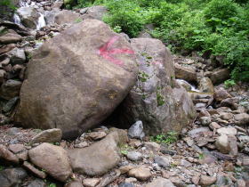 | 440m二股から尾根取付までは、渡渉を何度もしますが、大部分には沢の脇に踏み跡があり、水の中を遡行するところはほとんどありませんでした。踏み跡を辿るには赤布やケルンが頼りですが、最初は赤布ばかりを探していて見つからずうろうろしたことが何度もありました。ここ何年間も赤布やペイントマークを頼りに歩くことが多かったので、道標としてのケルンを忘れていたことを反省しました。 帰路注意してみると、赤布よりケルンの方が多いくらいでした。全般に沢の水量は少なく、沢足袋を履いていたので渡渉に困るようなところはありませんでした。 |