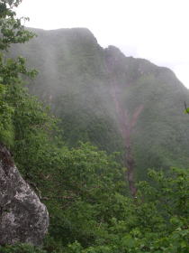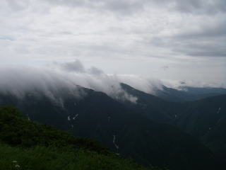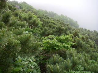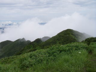 | 天気はだいぶ回復してきて、山頂に連なる尾根は見えるようになりましたが、ちょっと離れたところは見えませんでした。 |