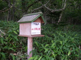 | 肉牛牧場に入る林道のゲートの鍵を借りて、ここの登山道の入口まで車で入ることが出来ました。駐車スペースはありませんが、豊似岳、二枚岳登山道入口の道標と入林届箱がありました。 豊似岳の方に林道が延びていましたが間もなくなくなり、尾根に取り付く辺りは下草のほとんどない樹林で踏み跡らしきものが幾筋もありました。少し登ると下草が増え、はっきりとルートを確認できるようになり、安心しました。 |