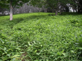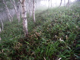 | 背丈の低い笹の道。視界は広いので気持ち良く歩ける。 |