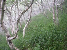 | 稜線に連なる急な斜面になるとつづら折れの道になり、ターンをするところでは、ガスっていることとも相俟って何度も何度も同じ景色を見ているような気がしました。 |