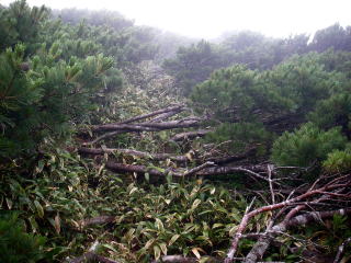 | 稜線よりちょっと下がったところについていた踏み跡を辿りましたが、消えてしまっているとこがたくさんあって、とうとう辿れなくなってしまいました。 うっかりして稜線から離れてしまい戻ろうとしましたが、稜線に出るにはハイマツの藪漕ぎをしなければなりませんでした。いわゆるハイマツの空中散歩で、わずかな距離でしたが随分時間がかかりました。 稜線に出るとハイマツを切り開いたルートに出て安心しました。 |