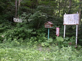 | 登山口の道標と入林届入れ、駐車スペース。道標にはポンヤオロマップ6.0km、ペテガリ14.0kmと書いてあり、ここに来る林道の道標にはペテガリ岳登山口と書いてありました。 |