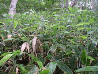 | 登山口を出発して間もなく雨が降り出し、雨具を着ける。雨はすぐに止んだものの藪が濡れているので雨具を脱ぐことはなかなか出来ませんでした。 藪はP1121付近がもっとも深く、地面を探っても踏み跡を見つけられず本格的な藪漕ぎになってしまいました。あまりにも遅々とした歩みになり、体力の消耗も激しかったので、一時は引き返そうと思いました。だが幸いなことに細い稜線だったので藪の薄くなったところで踏み跡に出ることができ、先に進めました。 |