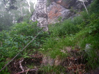 | 山頂近くの急な道に張ってあったロープ。ここを登るとゆるやかな道になり山頂へ。 |