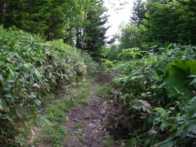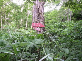 | 登山口。4,5台止められる駐車スペースがありました。ここから三合目の小屋までは林道のような幅の広い道でした。 |