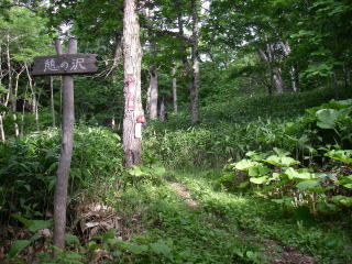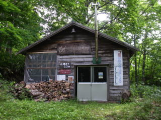 | 三合目にある武佐岳憩清荘と水場があるという憩の沢の道標。軒下には薪が積まれ、近くに水場がある立派な小屋でした。ここから山道になり、ちょっと登ると平坦な笹原の道になり、樹間に武佐岳が見えてきました。 |
