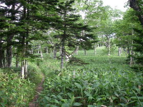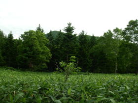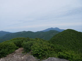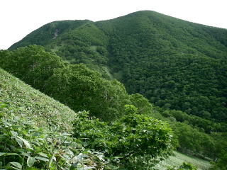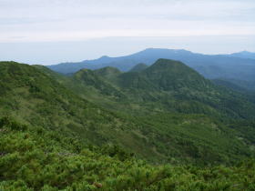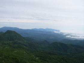 | 山頂からの展望。上空はだいぶ晴れてきて、遠くの山も見えるようになってきたので、西別岳、摩周岳に引き続いて登ることしました。 |