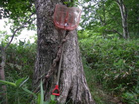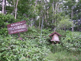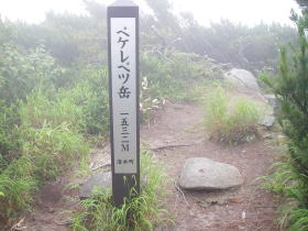 | 登山口は日勝国道の除雪センターの隣にあり、分かりやすい。前夜に雨が降り、当日も時々弱い雨がぱらついていたので様子見をしていました。 札幌ナンバーの方も来て待機していましたが、あきらめて帰って行かれました。 登山口でさえ濡れた藪が道にかっぶっているので、濡れるのは覚悟しなければならない状態でしたが、雨は上がりそうな気配だったので登ることにしました。 藪漕ぎで濡れ、眺望はなく、ただペケレベツ岳と書いた板を見ただけなので、札幌の方の判断が正しかったようです。 |