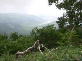 | 帰りにはガスが晴れてきて、P1343付近から日勝峠に上がる国道を目で追うと、登山口の除雪センターを確認できました。 |