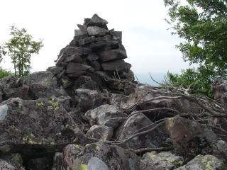 | 山頂のケルンと、ケルンに取り付けられた山名の板。ケルンを回るようにしてから下山すると、岩の積み重なりと草付きの境界の一部に踏み跡がありました。 |