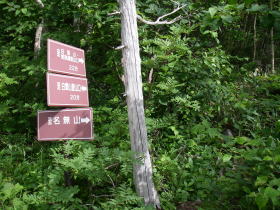 | 鞍部にあった道標。岩石山は名無山と書いてあり、ヌプカの里の方にも白雲山登山口があることが分かりました。 |