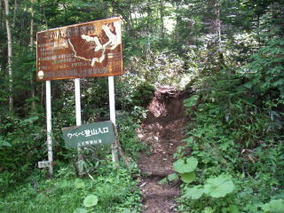 | 登山口。100mほどの所に大きな駐車スペース有り。ここに至る林道の糠平湖近くの入口にはウペペサンケ山と書いた道標があり、林道の分岐にはウペペと書いた道標があって迷いませんでした。 |