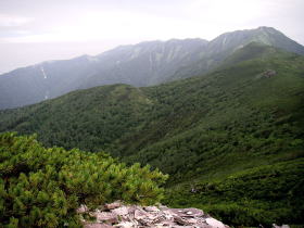 | P1601から見る糠平富士(右端)からウペペサンケ西峰の方に伸びる尾根。 |
